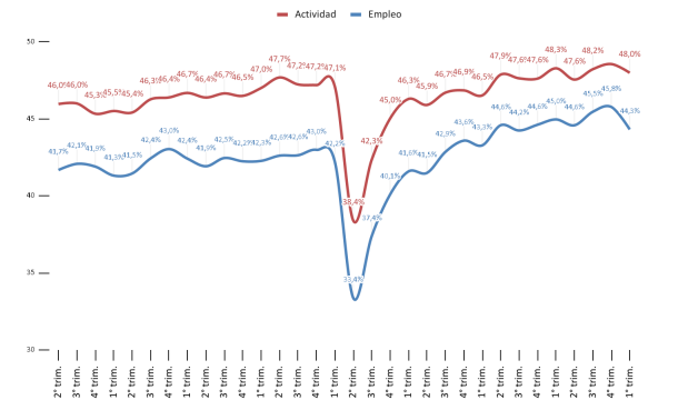 Tanto la tasa de actividad (48%), como la tasa de empleo (44,3%), registraron reducciones respecto del mismo trimestre del año previo (- 0.3 p.p y -0,7 p.p respectivamente).