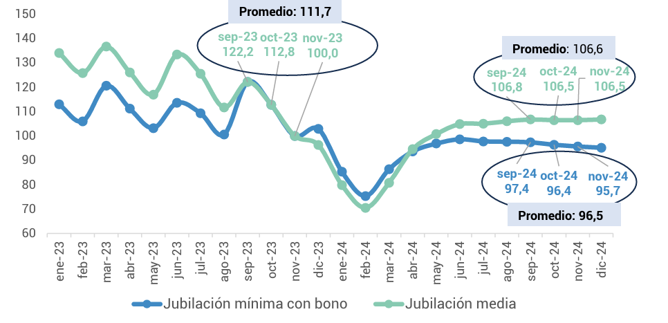 Gráfico 1. Evolución jubilación mínima con bono y jubilación media en términos reales. Enero 2023 – diciembre 2024. Base 100: noviembre 2023