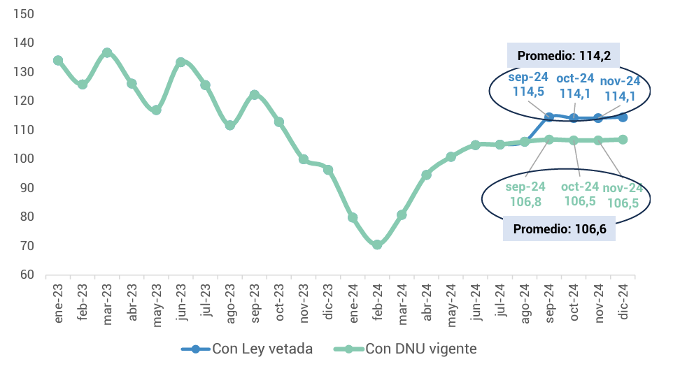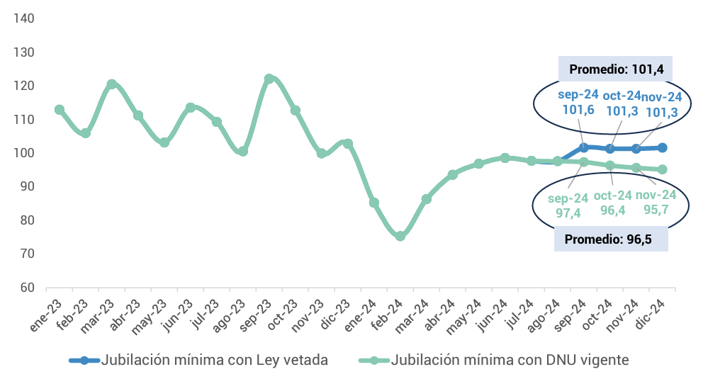 Gráfico 4. Evolución jubilación media en términos reales con DNU vigente y con Ley vetada. Enero 2023 – diciembre 2024. Base 100: noviembre 2023