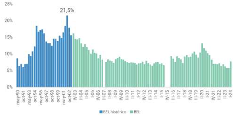 Gráfico 6. Tasa de desocupación. Mayo 1990 a mayo 2003 con BEL histórico y III trimestre 2003 a I trimestre 2024 con BEL