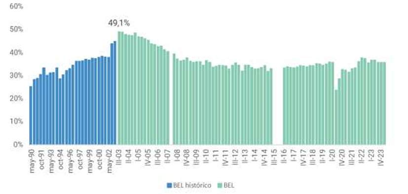 Gráfico 7. Tasa de empleo no registrado. Mayo 1990 a mayo 2003 con BEL histórico y III trimestre 2003 a I trimestre 2024 con BEL