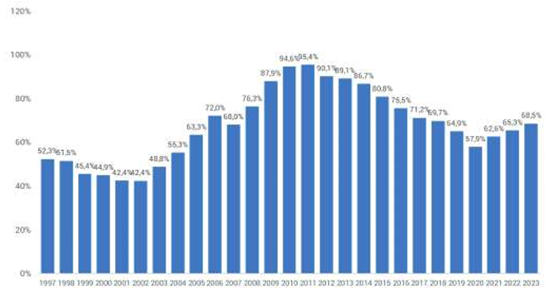 Como puede observarse en el gráfico a continuación, en 2015, con 2,5 millones de personas ya incorporadas al sistema vía moratorias, el gasto contributivo de seguridad social era cubierto en más del 80% por la recaudación del propio sistema de la seguridad social. Esto se debe a la mejora de salario, el empleo y la recaudación. Por el contrario, durante el menemismo y macrismo, esta relación disminuyó sistemáticamente hasta 64,9%, por la merma de ingresos por 4 vías:
