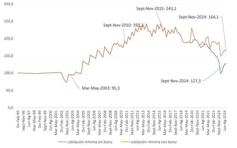 Gráfico 9. Jubilación mínima con y sin bono en términos reales. Periodo: Diciembre 1995 – noviembre 2024. Base 100: diciembre 1995