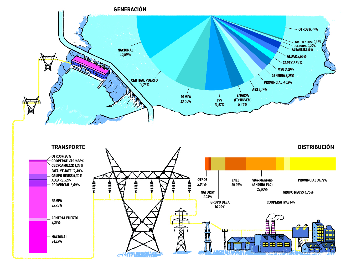 Pero existe una matriz que CAMMESA no ofrece y se reconstruye a partir de cruzar datos con la información del Ente Regulador de la Electricidad (ENRE). Este control detallado del sistema nos permite conocer también a los dueños de la energía eléctrica, ponerles nombre y apellido.